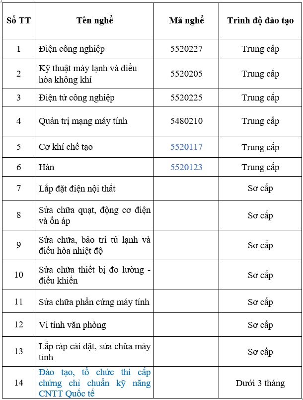 Trường đã được cấp giấy chứng nhận đăng ký hoạt động giáo dục nghề nghề nghiệp với những nghề sau: